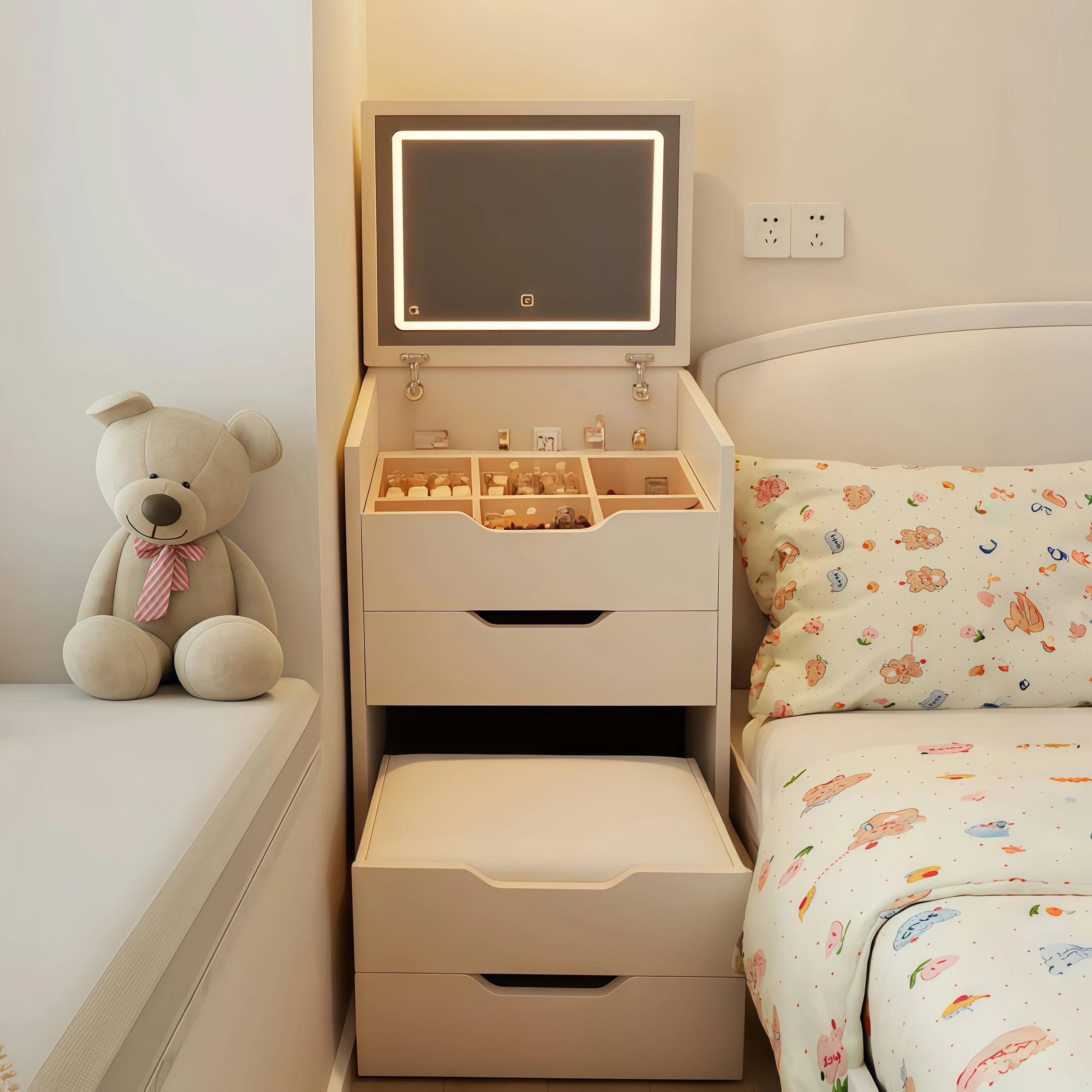 Creamy Minimalist Makeup Vanity with Flip Mirror and Integrated Storage – Multifunctional Bedside Table for Small Spaces. Perfect for Organizing Your Beauty Essentials!