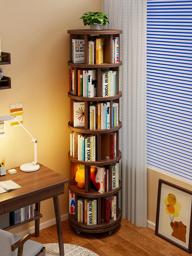 360-Degree Rotating Bookshelf - Space-Saving Solid Wood Floor Stand with Wheels, Ideal for Students' Storage and Organization