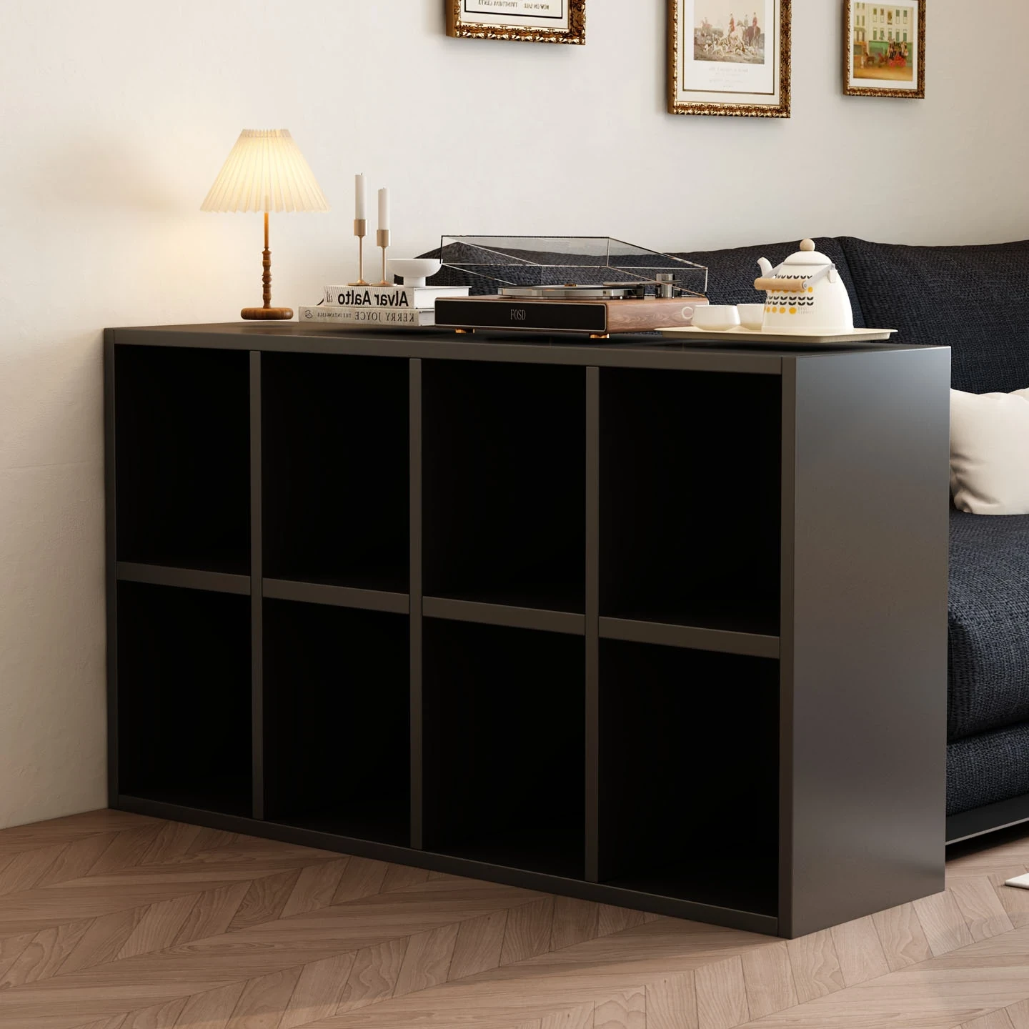 Kaleck Wall-Mounted Bookshelf with Eight Compartments - Stylish Black Divider Cabinet for Sofa Side, Ideal for Bedroom Storage and Organization
