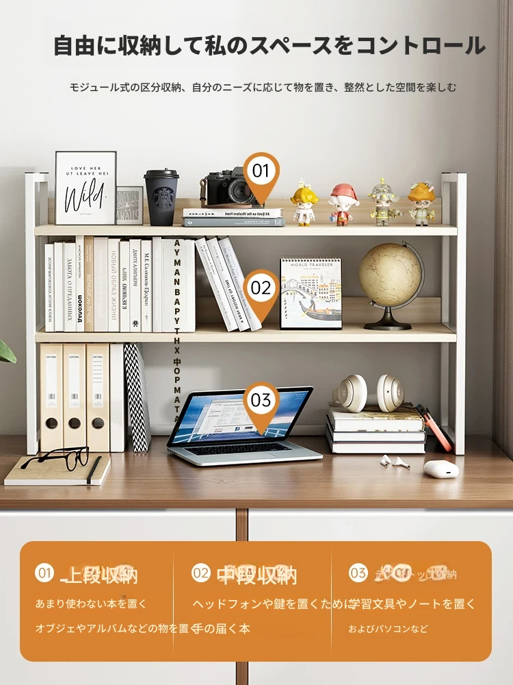 シンプルでおしゃれな木製風デスク上収納ラック|学生やオフィスに最適なコンパクトな本棚|整理整頓を助ける多機能デザイン!