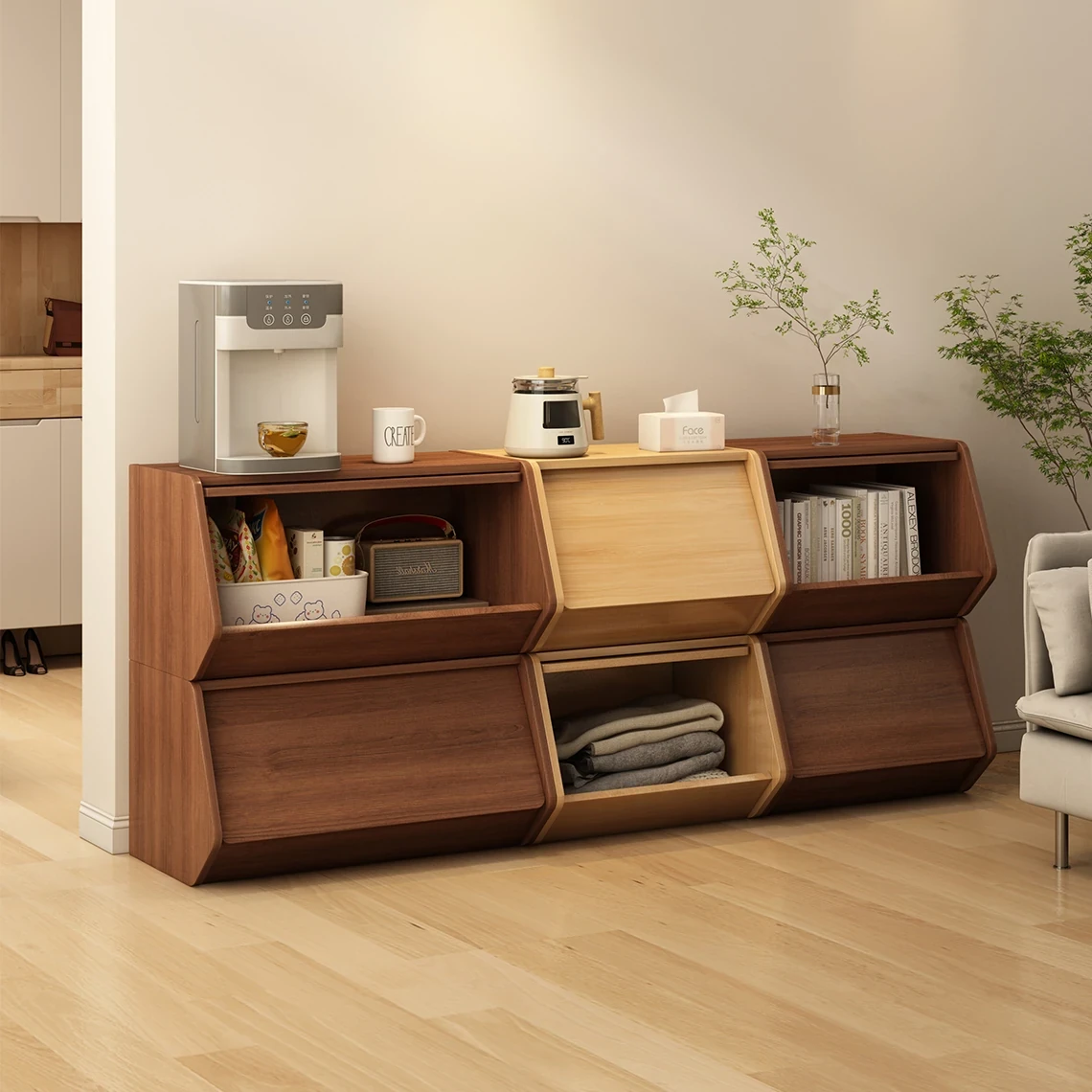 ナチュラルウッドの重ねられる収納キャビネット - リビングルームに最適なスタイリッシュなサイドボード、コンパクトで多機能な引き出し付き、雑貨収納やベッドサイドテーブルとしても使える!