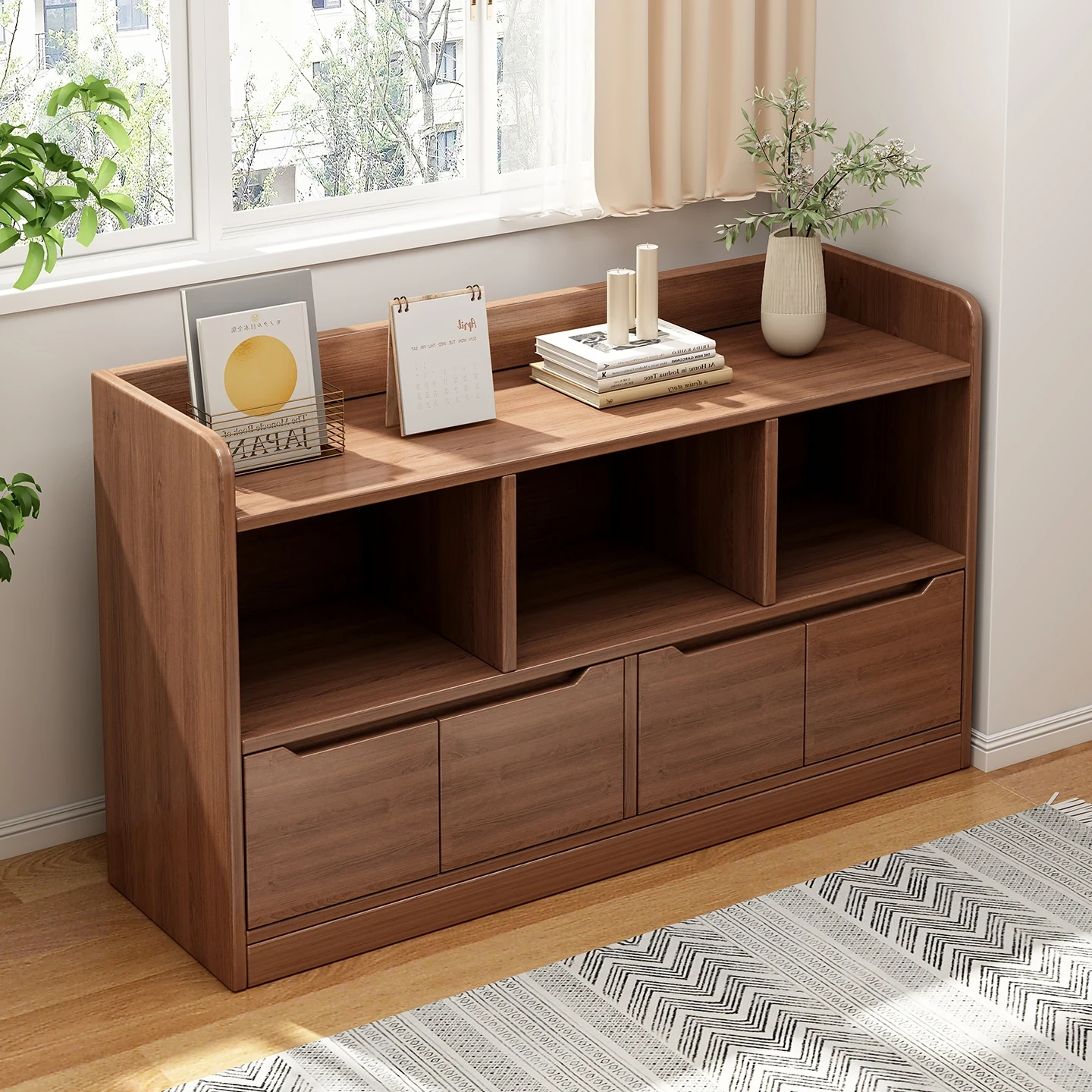 黒いチェック柄のフロア書棚、リビングやソファ脇にぴったりの収納ラック!引き出し付きの収納キャビネットで、お部屋をすっきり整理整頓。ベッドサイドにも最適なデザインです!