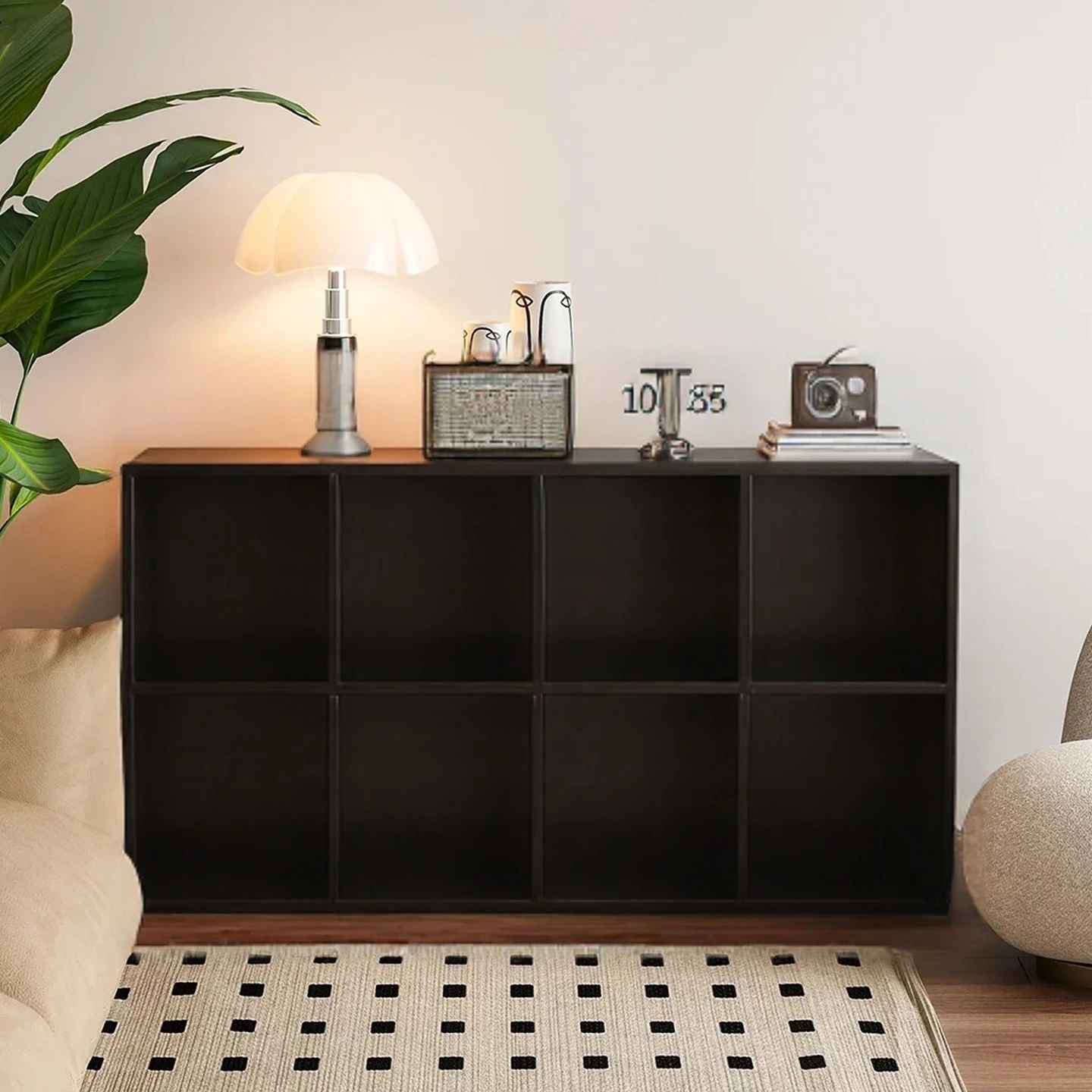 レトロなブラックの格子キャビネット、リビングや寝室に最適な収納力抜群のオープンシェルフ!8つのコンパートメントで、スタイリッシュに本や小物を整理整頓。おしゃれなインテリアを演出します!