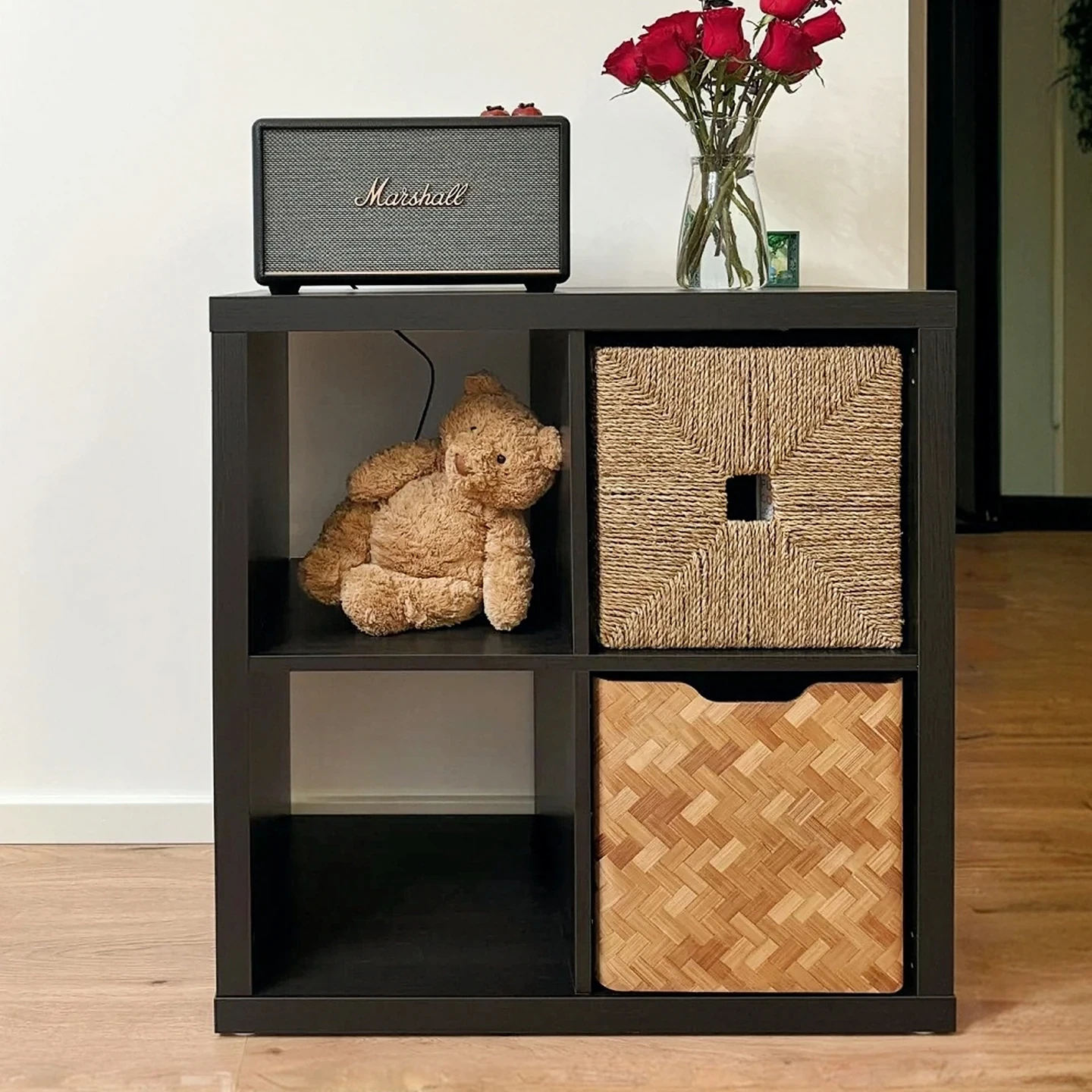 おしゃれなフロアシェルフ!ソファサイドの仕切りキャビネットとしても活躍。リビングにぴったりの壁寄せ展示棚。自由に組み合わせ可能な格子型収納で、スタイリッシュに整理整頓を実現!