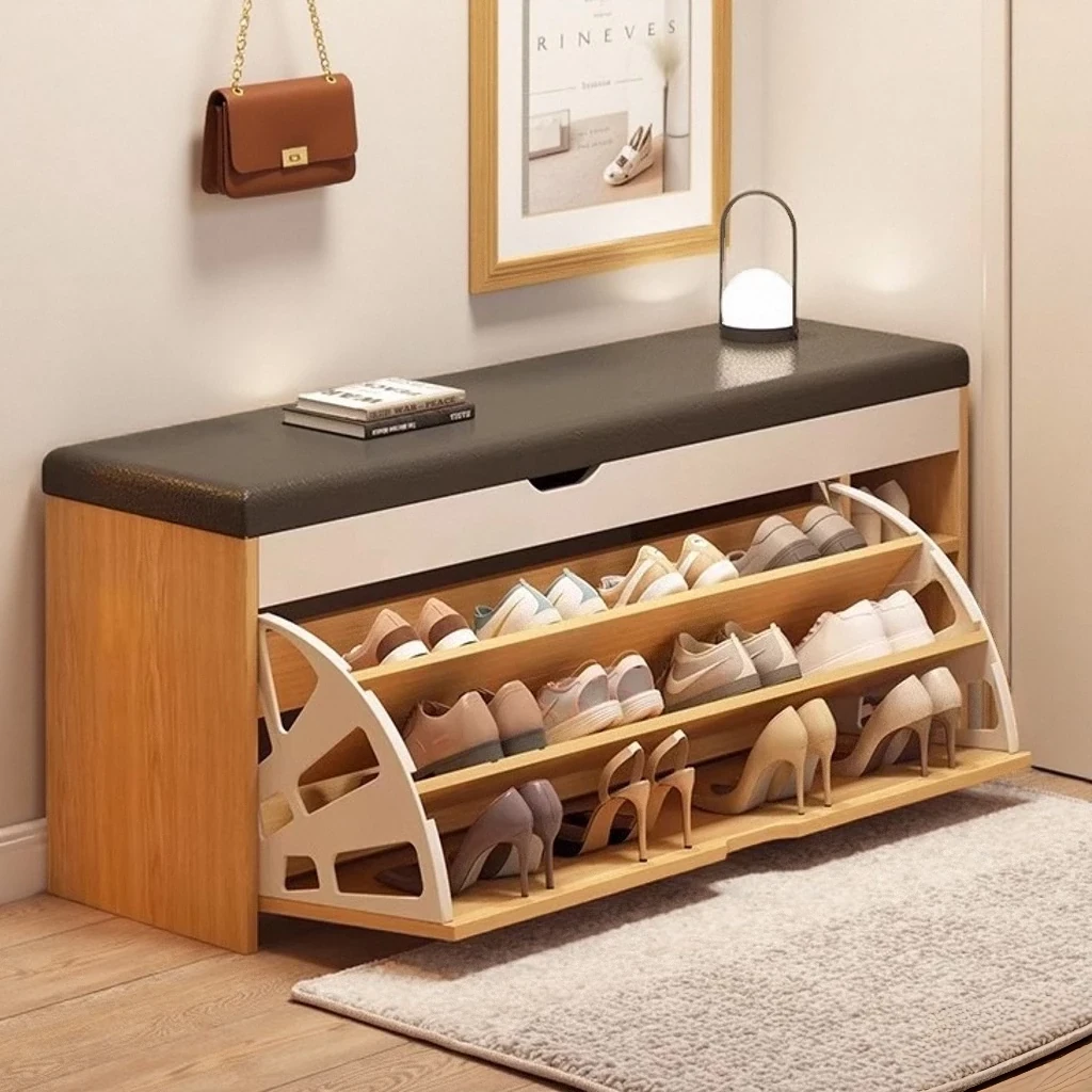 玄関用スリッパベンチ|シューズラックと一体型のソフトクッション付き|快適な着脱空間を提供|スタイリッシュなデザインで家の入り口を彩る!