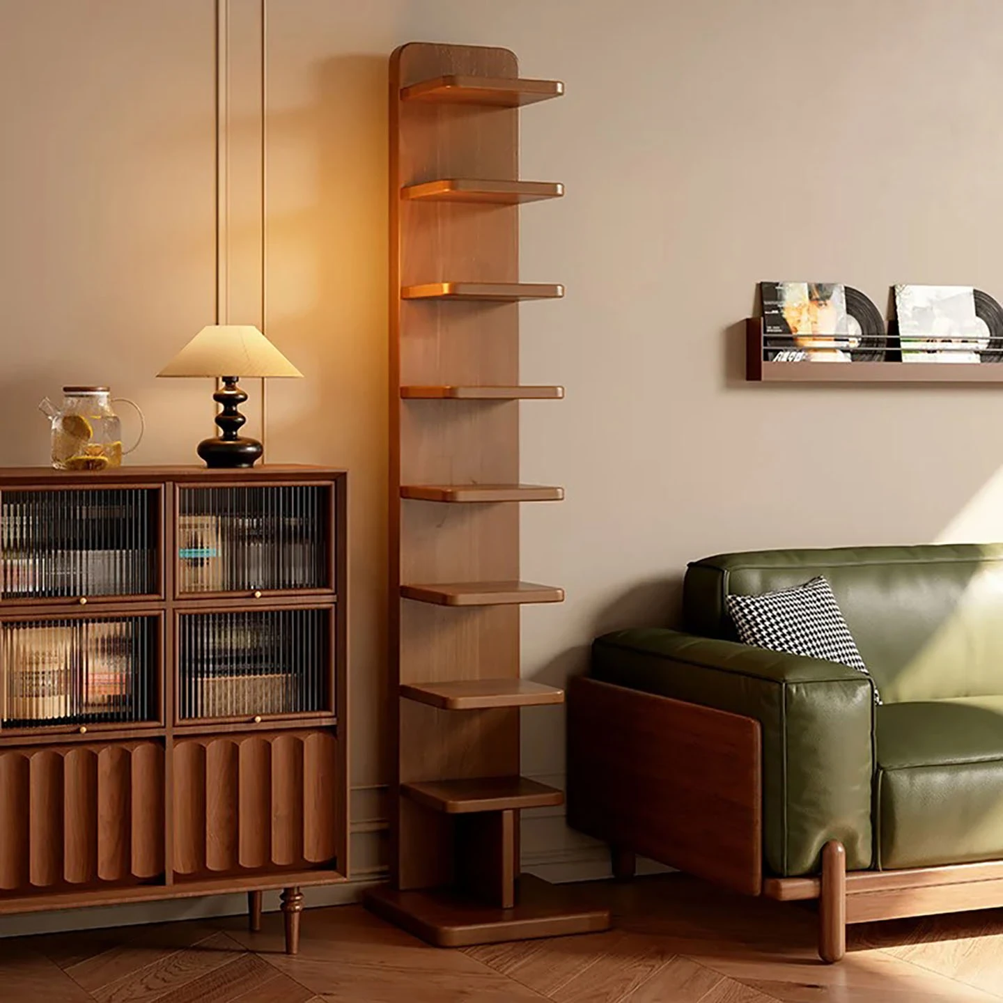 天然木材使用の360度回転式書棚!和風デザインの収納・展示ラック、絵本や雑貨を美しく飾る円形シェルフ。家族みんなが楽しめる、あなただけの素敵な空間を創造します!