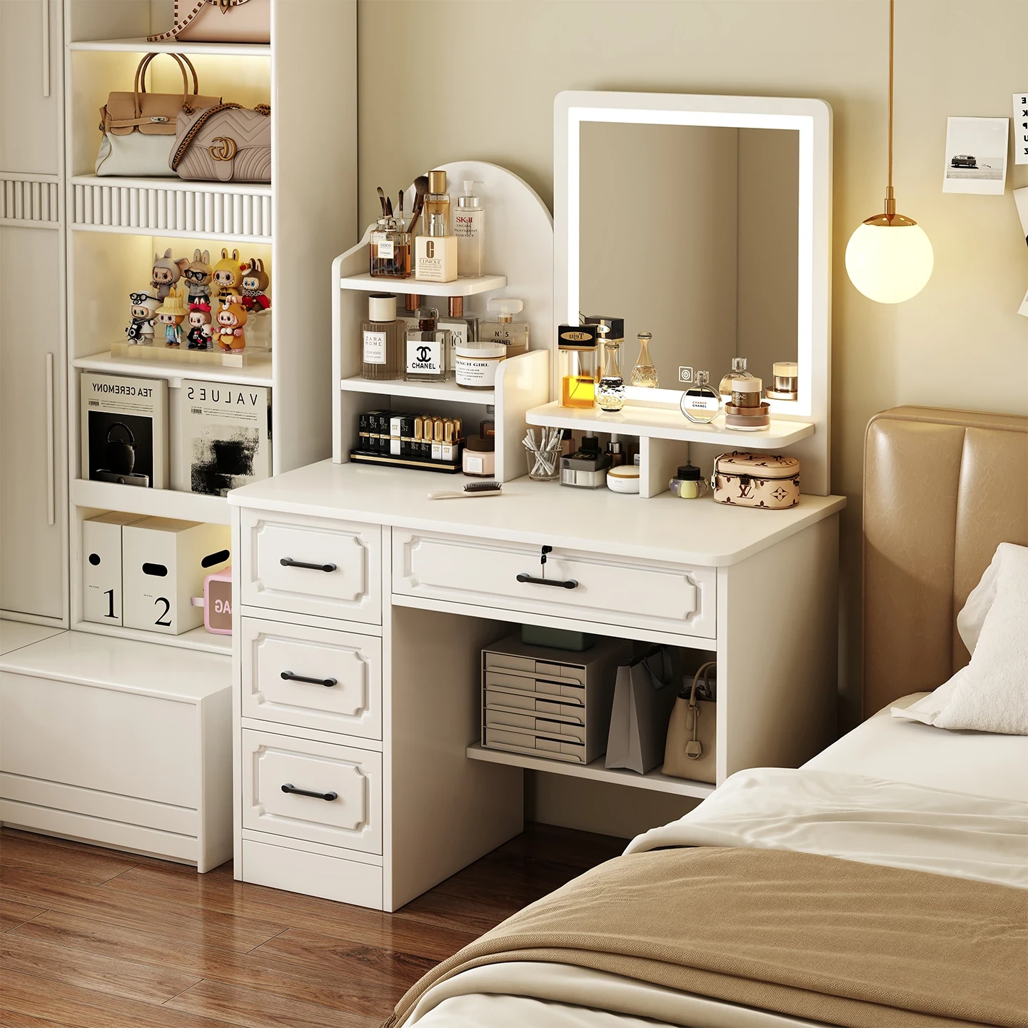 2025 New Modern Minimalist Makeup Vanity for Small Spaces - Stylish Bedroom Corner Dressing Table with Integrated Nightstand and Storage Cabinet