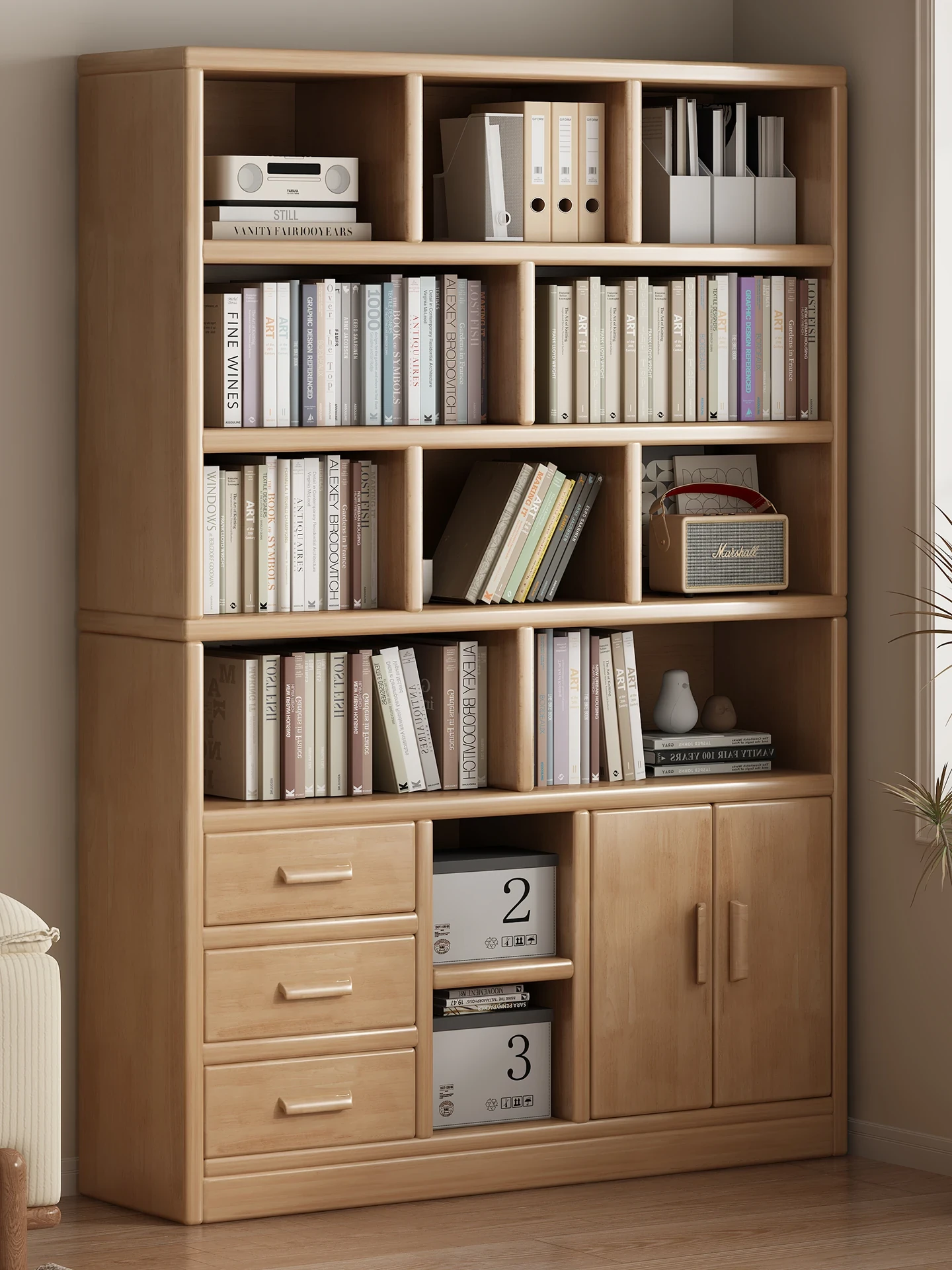 Natural Wood Bookshelf and Storage Cabinet with Doors - Stylish Floor-Standing Display Unit for Home Use, Multi-Compartment Organizer for Books and Decor